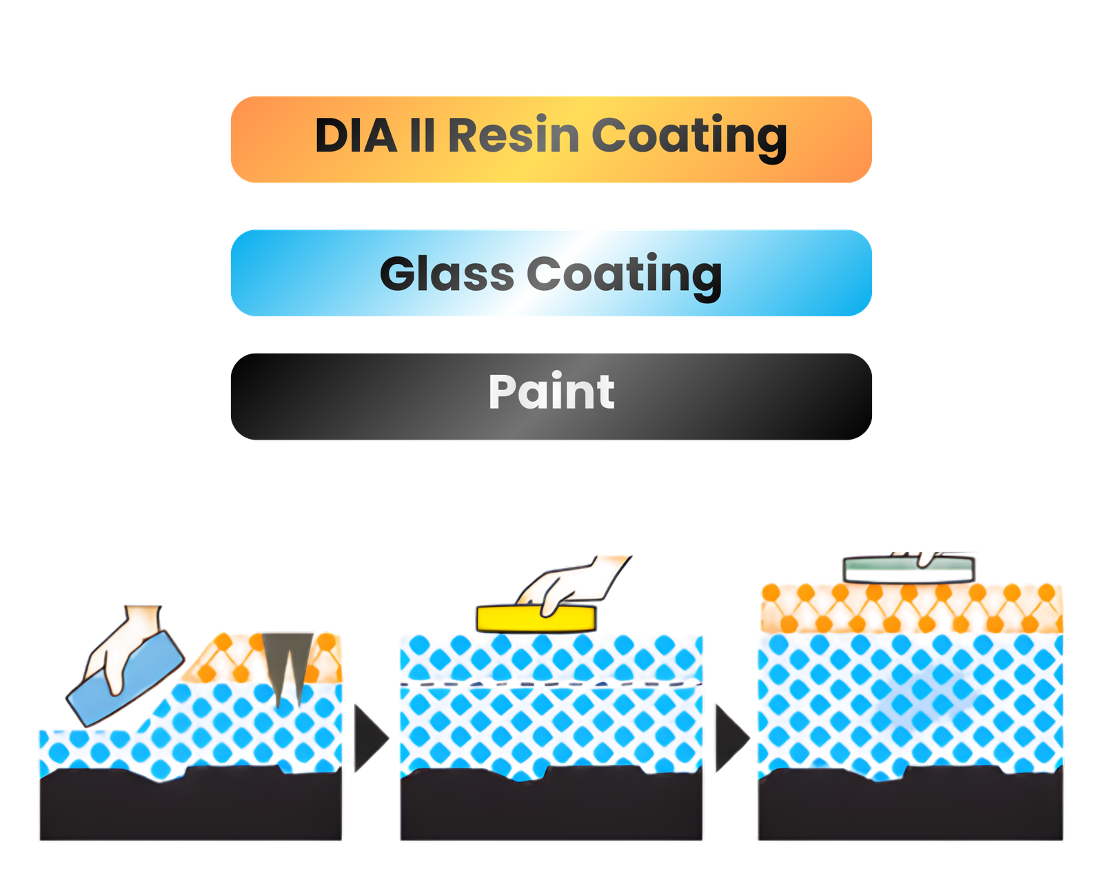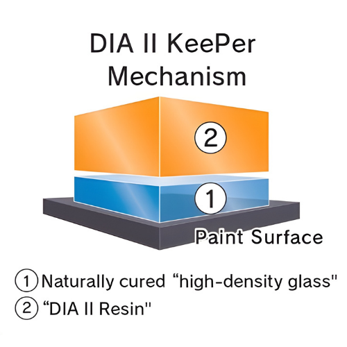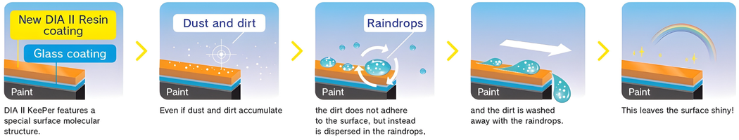 The DIA II KeePer possesses a unique anti-soiling capability that prevents dirt from adhering tightly, and even if dust accumulates, it does not adhere to the painted surface. When natural rain falls, its inherent water repellency allows dirt to be washed away along with the rain, leaving the surface clean as if it has been washed.